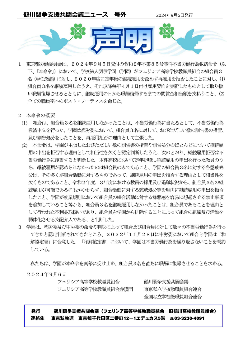 2024年9月7日 共闘会議ニュース号外 都労委命令声明
